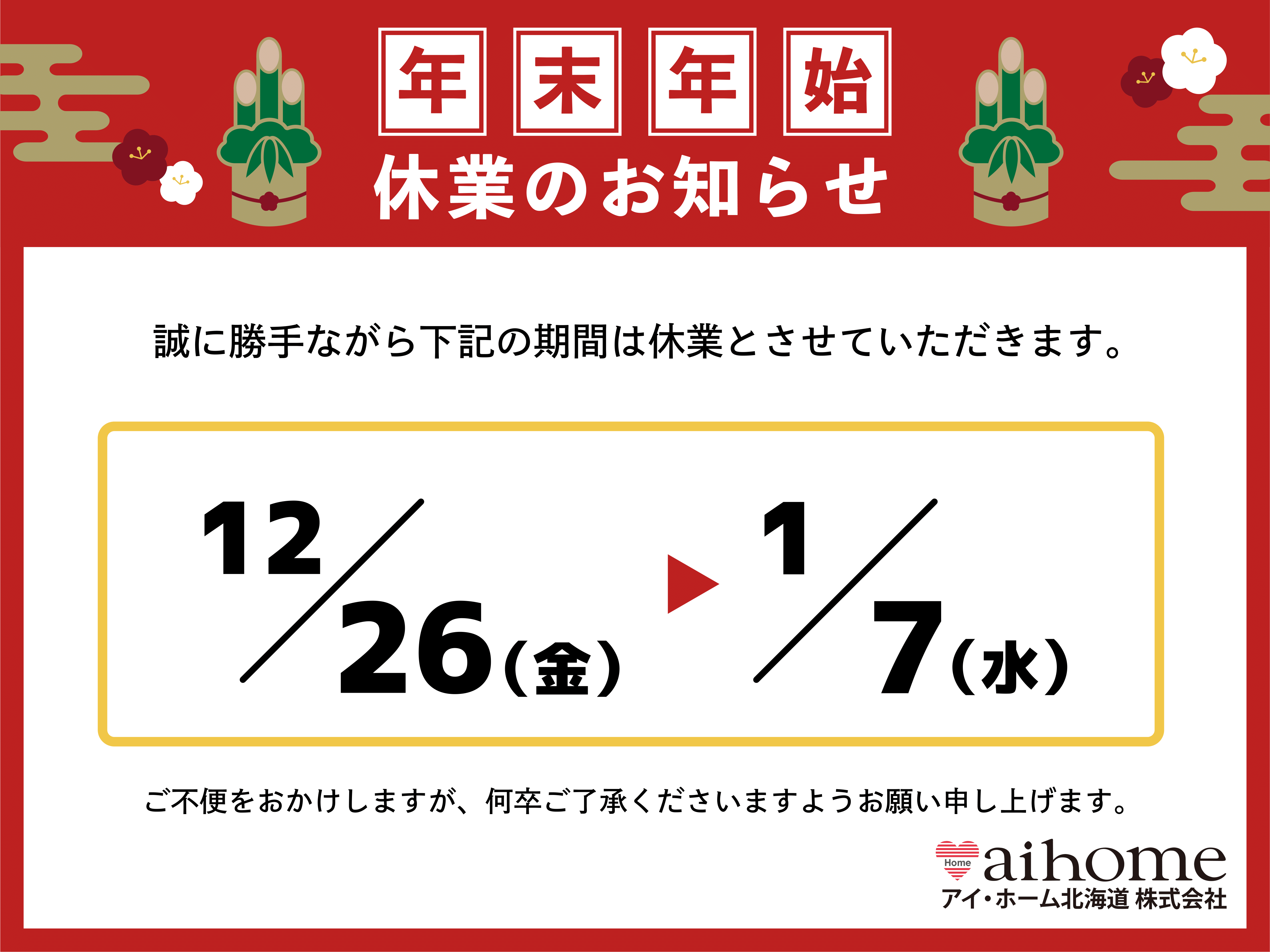 アイ・ホームの年末年始休業は下記の通りとなります。